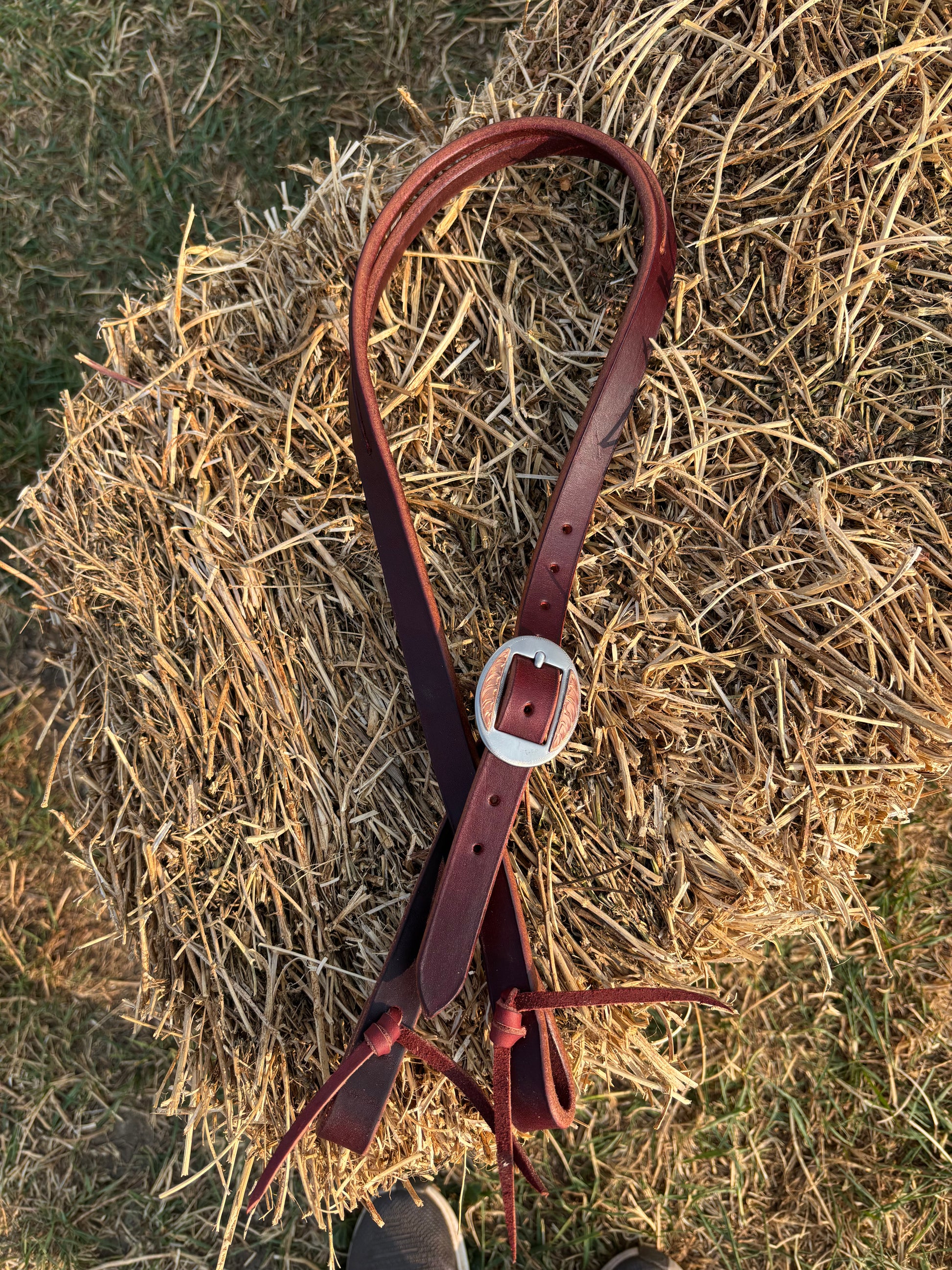 One of a kind headstall buckle with hand engraved copper accents on a heavy split ear Latigo headstall. Adjusts from 36”-42” (Medium/Long length)